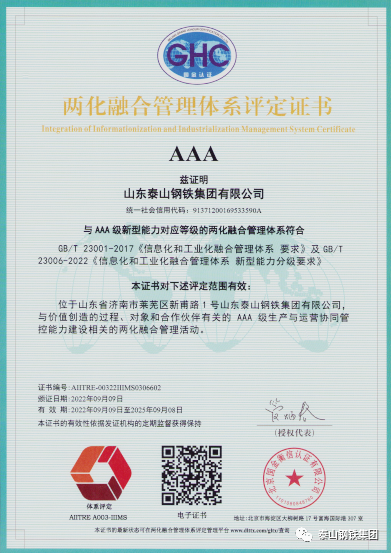 近日,泰山钢铁集团正式通过信息化和工业化融合(以下简称两化融合)管理体系认证,取得“两化融合管理体系AAA级评定证书”,成为济南市唯一、山东省第二家、全国冶金行业第十位获AAA级认证的钢铁企业。