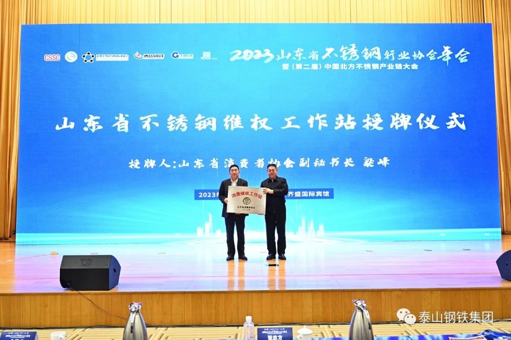 会上还举行了授牌仪式,梁峰代表山东省消费者协会向山东省不锈钢行业协会授予“消费维权工作站”牌匾,王大中代表山东省不锈钢行业协会接受授牌。